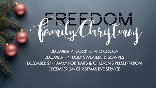 Fun for the whole family each week! Make your Christmas season meaningful and memorable- with a different theme every Sunday, inspiring messages and a lot of fun, all leading up to our Christmas Eve service.