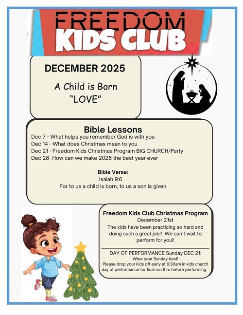 Join us for music, games, prizes, and fun each week as we learn what it means to be a child of God! Your student will be encouraged and look forward to every opportunity to be a part of the Freedom Kid's Club! Visit our group online to stay up to date on upcoming events and opportunities.